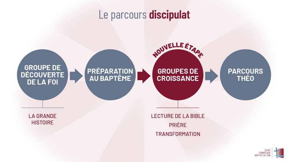C’est un outil dont nous vous encourageons à vous saisir pour poursuivre votre croissance dans la foi, aux côtés de ce que nous vivons déjà : les cultes bien sûr, mais aussi les groupes de quartier. Les groupes de croissance trouvent tout naturellement leur place dans le parcours de discipulat que nous mettons progressivement en œuvre dans notre communauté :